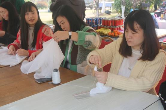 在简短的休整后,趣味活动拉开序幕,女同胞们以抽签方式分为4组,每两组同时进行吹乒乓球、背向投壶、乒乓球对打、双人踢毽子、夹弹珠五项趣味游戏计时接力赛。比赛过程中,每组队员通力合作、互勉互励,各组之间你追我赶、各显神通。